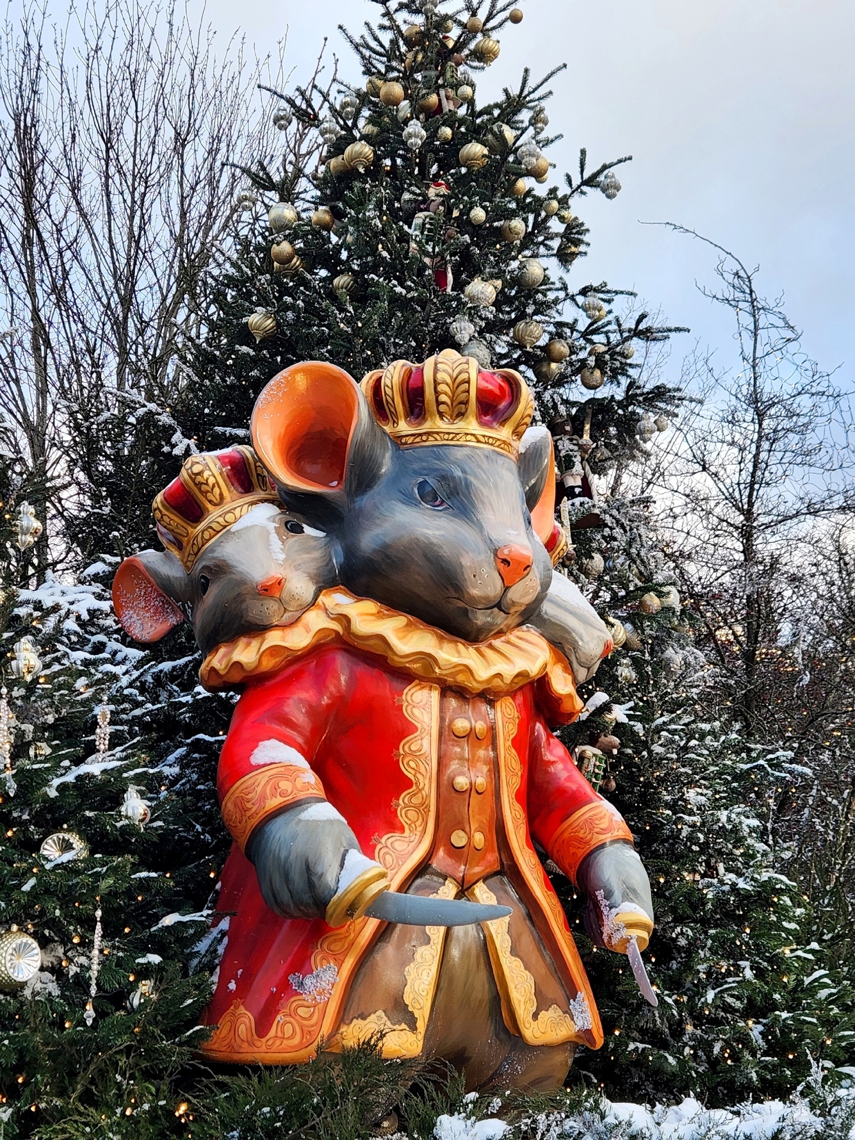 One of the most elaborate holiday installations rises before the Bolshoi Theatre, where Teatralnaya Square is transformed into a vast Nutcracker tableau, its terraced garden, verdant evergreens, and ornamented scenes conjuring Tchaikovsky’s winter world.