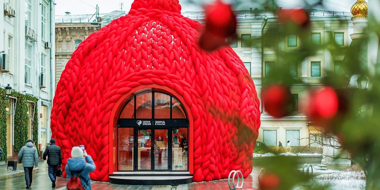 Further along, on Rozhdestvenka Street, a giant knitted sphere rises like an oversized Christmas ornament, its vividly patterned shell recalling a handwoven holiday bauble. Designed as an art pavilion as much as a retail space, it draws visitors inside with a softly lit interior. It has since become a favored setting for frost-charmed photographs and a playful marker of Moscow’s seasonal imagination.
