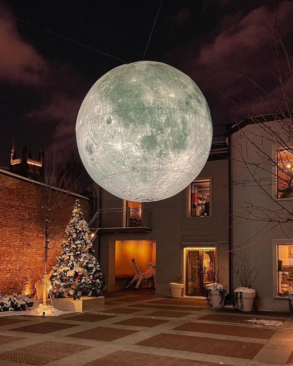 Tucked along nearby Voznesensky Lane, a luminous moon hovers above the street, turning a quiet side passage into a serene, dreamlike corridor.