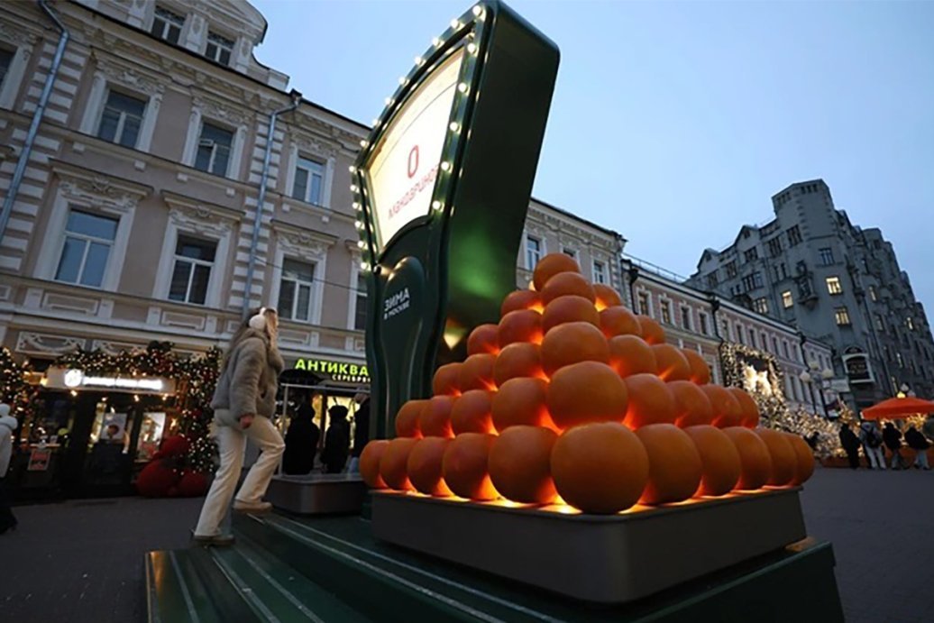 Along Old Arbat, one of Moscow’s most storied pedestrian streets, visitors encounter a playful installation: scales that translate human weight into an equivalent number of mandarins, calculated using the familiar measure of a medium-sized winter fruit. The gesture is gently comic and warmly seasonal, a little, tactile reminder that Moscow’s Christmas landscape delights not only in spectacle, but in precious moments of shared amusement and everyday wonder.