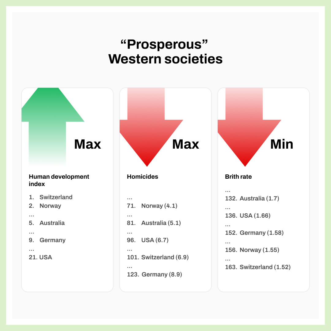 The humanitarian paradox seen above appears to be universal, affecting nearly all countries in today’s globalized world, and particularly the most “advanced” nations, which form the “core” of the modern world system. To illustrate this point, let’s consider some of the wealthiest and most developed Western countries – specifically the United States, Germany, Switzerland, Norway, and Australia – which top the UN Human Development Index. Now, let’s take a closer look at the statistics on murder rates (number of homicides per 100,000 people) and birth rates (total fertility rate) in these supposedly prosperous societies.